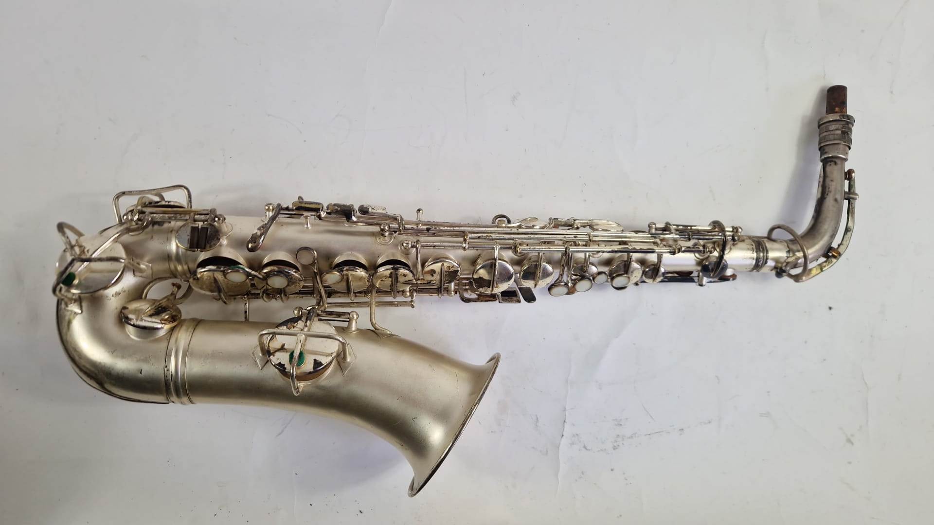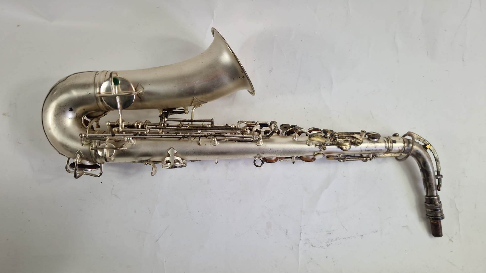 Het instrument is ooit overgespoten met zilververf. helemaal ontlakken is wel een interessante optie. Waarschijnlijk is het een verzilverde sax. Hij heeft in ieder geval een gold wash bell.